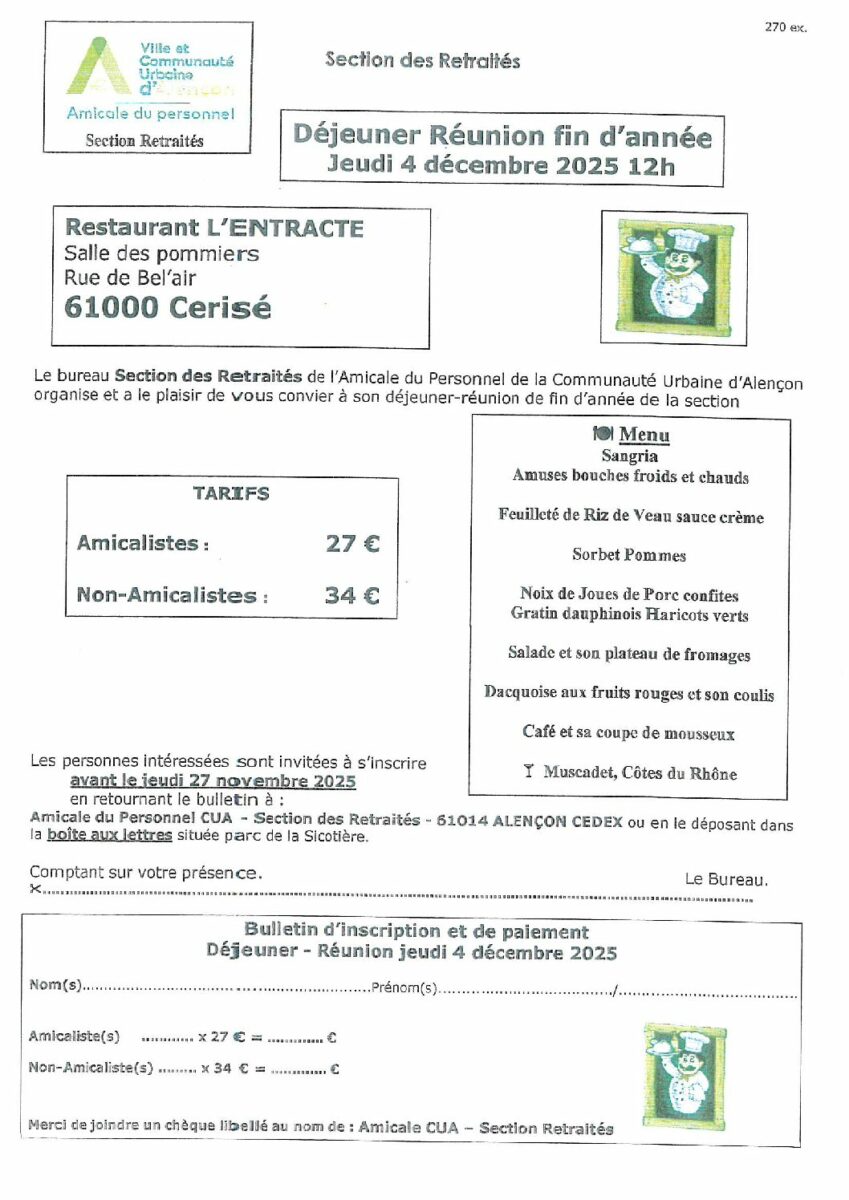 Section retraités – Déjeuner réunion fin d’année 4 décembre 2025 Posted on3 novembre 20253 novembre 2025- Activités section retraités Déjeuner réunion jeudi 4 décembre 2025Télécharger