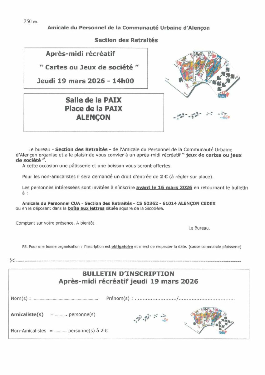 Après-midi récréatif cartes – jeudi 19 mars Posted on3 mars 20263 mars 2026- Activités section retraités Après-midi récréatif cartes 19 mars 2026Télécharger